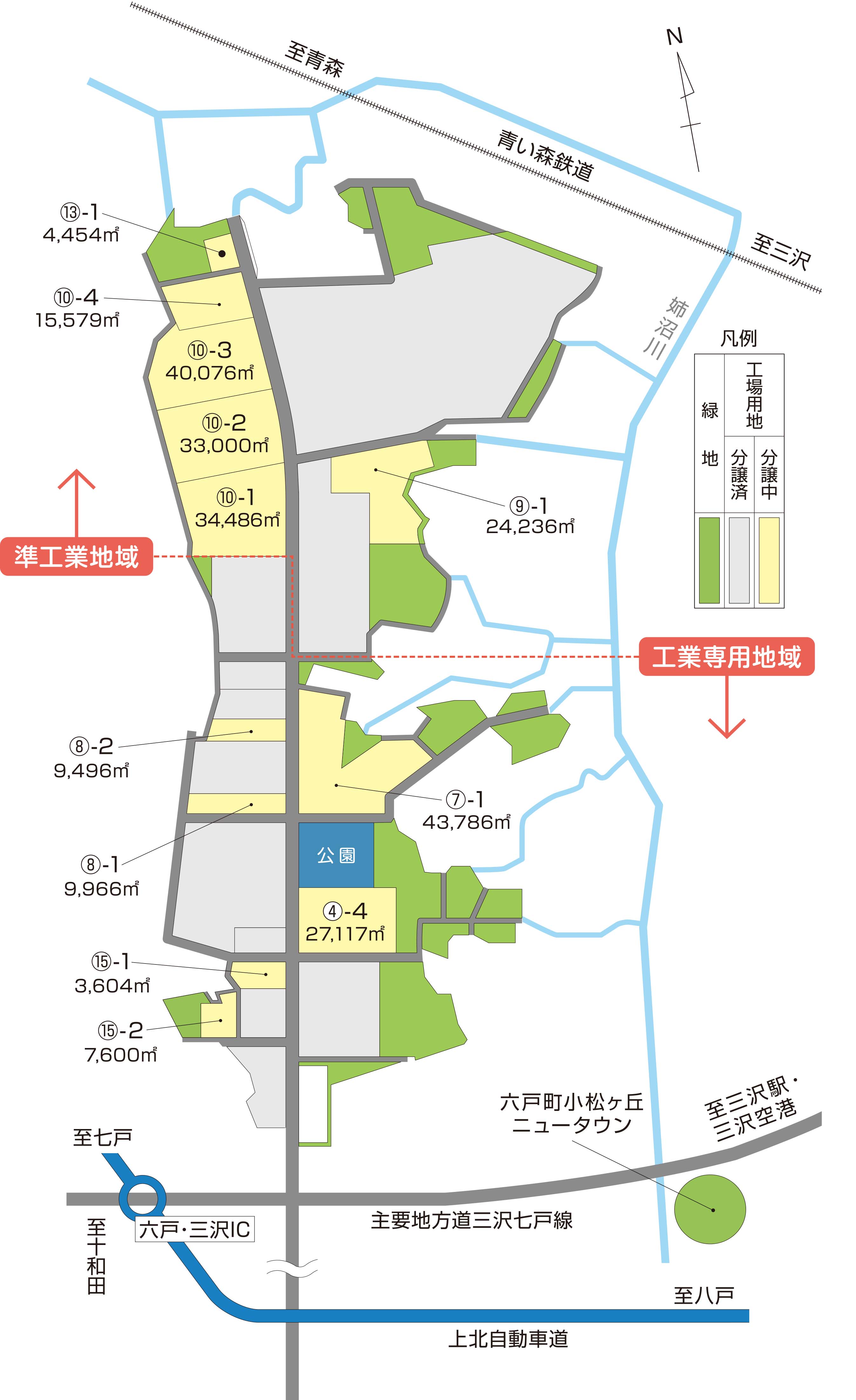 | 特記事項 | 金矢工業団地は、青森県の「県南地域」の拠点工業団地として、県が計画した工業団地です。 ■所在地…青森県上北郡六戸町金矢1丁目~3丁目 ■総面積…99.8ha(うち工業用地面積65.8ha) ■上水道…800㎥/日(概算) ■排水先…姉沼川(企業内処理) ■電力…普通電圧:6kV団地内設置済 / 特別高圧:60kV六戸変電所から引込み(団地東側700m付近) ■地域指定…工業立地法特例団地、地方拠点都市地域、農村産業法産業導入地区、電源地域、 原子力発電施設等立地地域、地域未来投資促進法促進区域 ■八戸港コンテナ定期航路…〇中国・韓国航路 〇韓国航路 〇国際フィーダー航路 ※区画面積または譲渡価格は変更する場合がございます。 |
